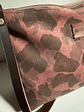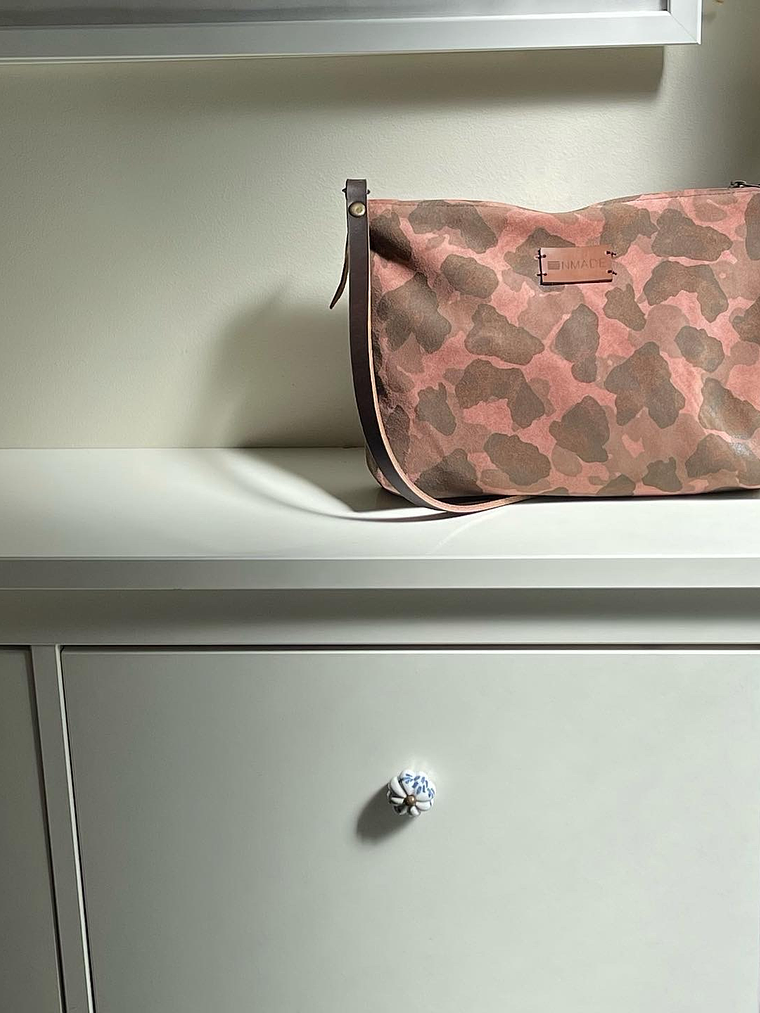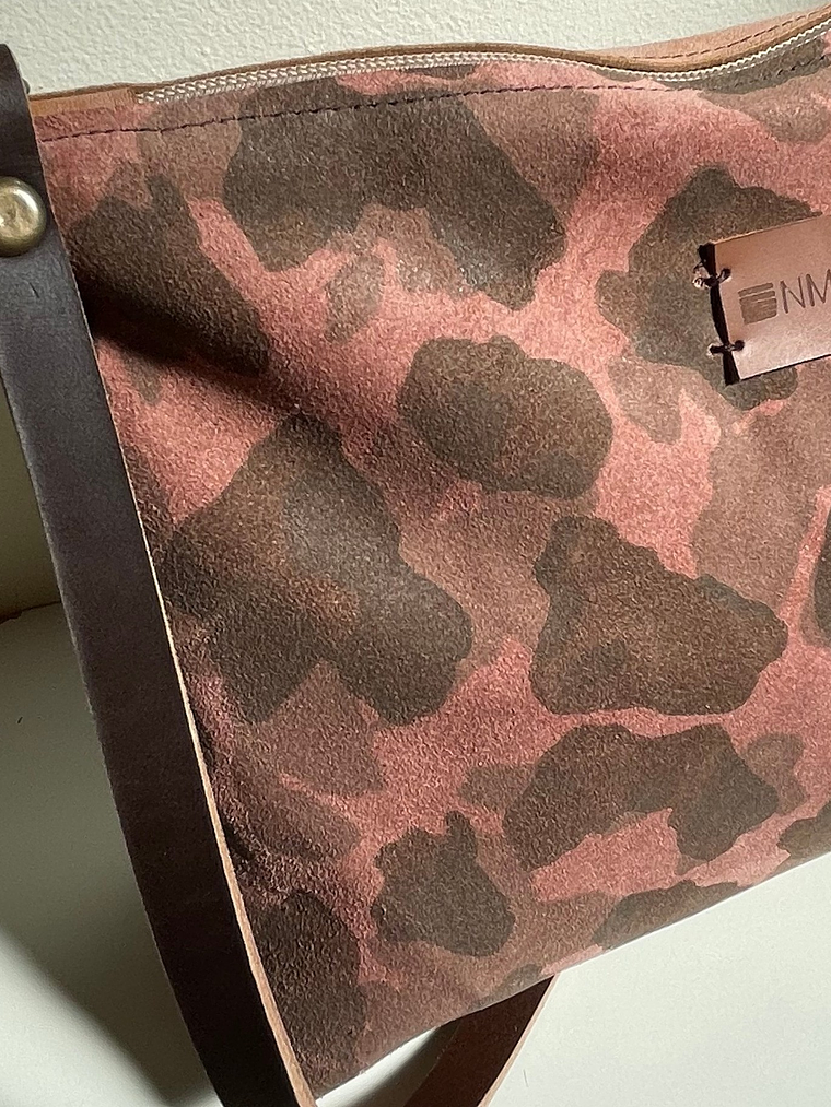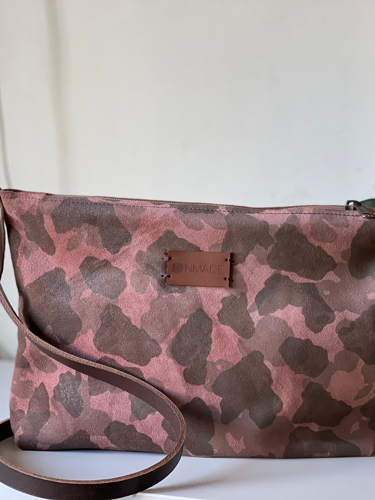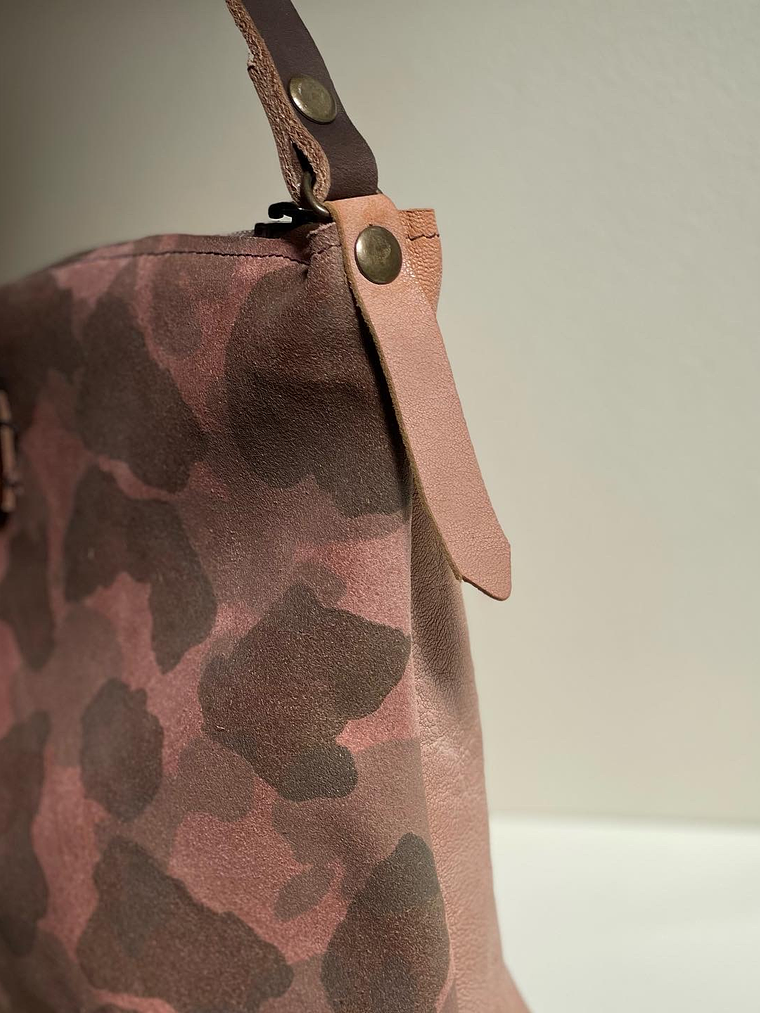Pele padrão camuflado em tons de rosa e castanho, parte de trás castanho liso.